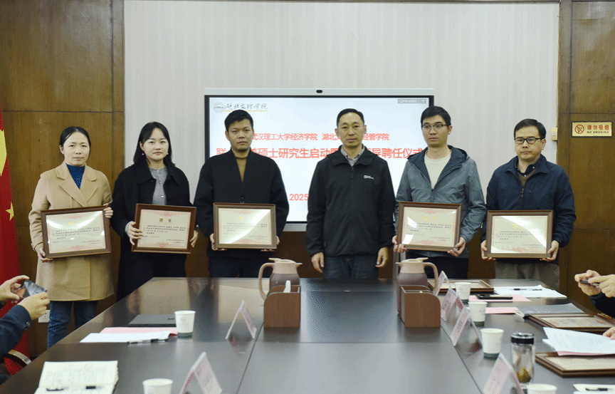 随后举行兼职硕士生导师聘书颁发仪式。由武汉理工大学经济学院党委书记张光华、副院长余谦共同为受聘导师颁发聘书。