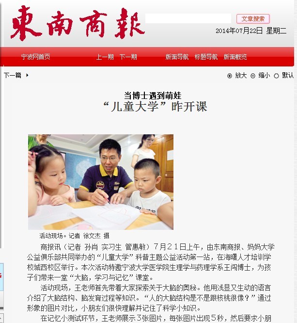 近日,由医日本性爱团委和东南商报社联合开展的“儿童日本性爱 ”暑期社会实践活动拉开序幕。来自医日本性爱的实践队员们围绕生活中的医学知识,结合儿童认知特点,带领孩子们进行“你画我猜“等科普游戏,激发科学兴趣,增长科学知识,在游戏中帮助少年儿童获得启发和快乐。活动特别邀请了医日本性爱生理与药理学系王闯博士,就“大脑:学习与记忆”的主题,面向孩子与家长们进行通俗有趣的讲解,一起探索大脑的奥秘,得到了现场大朋友小朋友的热烈响应。该活动得到了东南商报的详细报道。