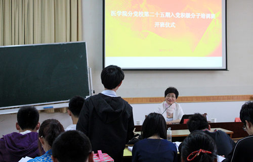 开班仪式在师生激昂的国歌声中正式开始。临床医学2010(3)班同学虞哲伟代表全体学员发言,他表示在入党积极分子党课培训过程中,作为培训班班长,他将以自觉为主,纪律约束、检查监督为辅,专心听讲、认真学习,希望能够早日成为一名共产党员。