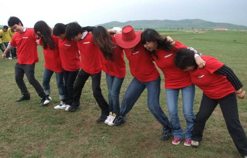 (2)所有的参赛队员按男女交替站成肩并肩的一排,然后用短绳子将相邻队员的脚踝绑在一起,然后整体侧向移动,比如:以全部队员面向西为例,那么整体移动的方向为南;
