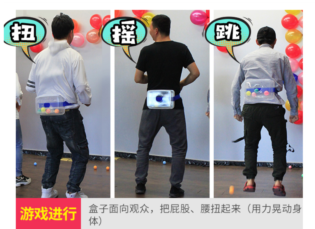 (2)每名队员腰上绑上放有乒乓球的小盒子,在一分钟内通过摇、晃、跳等各种方法将乒乓球从盒子里抖出,统计盒内剩余乒乓球数,数量少者获胜。