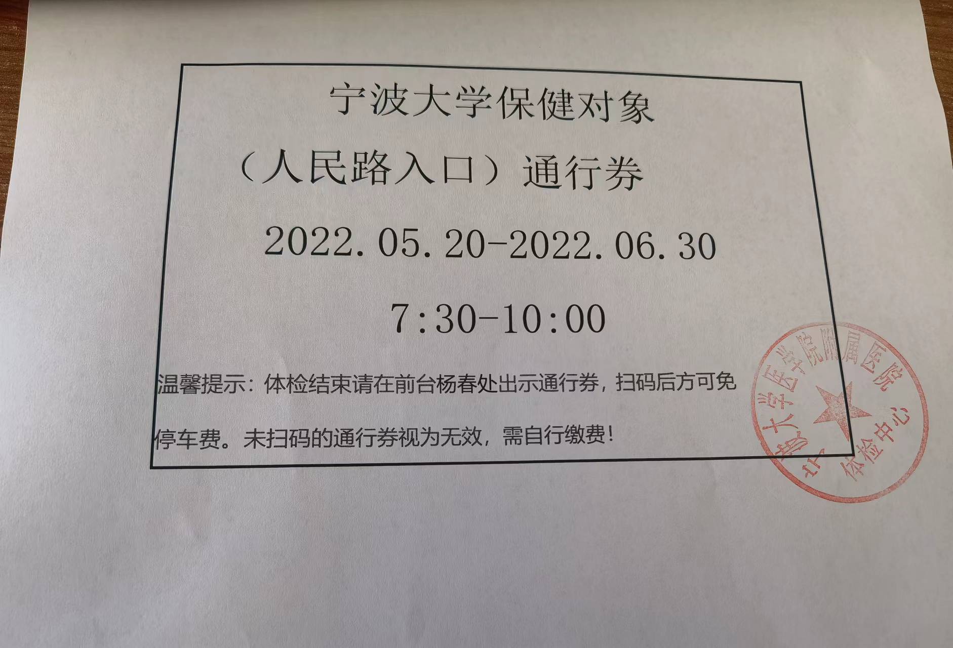 请各单位、部门通知本部门的人员,如需开车前往体检,请自行打印“通行券”(此券为人民路入口的通行券,非停车券),通行券有效日期为2022年05月20日至2022年06月30日(双休日及节假日除外)。凭通行券可由人民路的正门驶入。体检结束后请务必在前台杨春处出示通行券并扫码后方可免停车费。未扫码的通行券视为无效,需自行缴费。