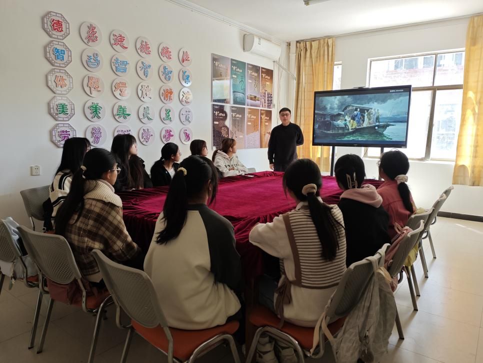 活动依托一站式学生社区文化育人平台,学院辅导员李焱明以何红舟、黄发祥在2009年创作的经典油画《启航——中共一大会议》为教学载体,通过"艺术解码+历史阐释"双维视角展开导赏。主讲人从艺术风格、笔触肌理、构图章法、色彩表达几个方面,深入解析作品如何以艺术语言定格中共一大南湖会议登船启航的历史瞬间,并传授美术鉴赏方法,引导学生读懂红色经典中的精神密码。"画面中压顶的乌云与船头曙光形成强烈对比,这种艺术表现让我们更直观感受到建党先驱的信念力量。"参与活动的同学表示。