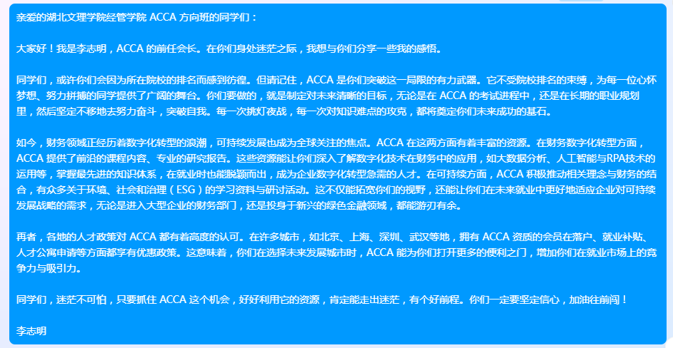 李志明在信中强调,ACCA作为全球最具规模的国际专业会计师组织,在运用大数据分析、人工智能与RPA技术推动财务数字化转型,在推动环境社会治理(ESG)理念与财务相结合助力可持续发展等方面,提供了前沿的课程内容、专业的研究报告和丰富的研讨活动。“ACCA 能为你们打开更多的便利之门,它不受院校排名的束缚,为每一位心怀梦想、努力拼搏的同学提供了广阔的舞台”,通过ACCA专业教育,“增加你们在就业市场上的竞争力与吸引力,无论是进入大型企业的财务部门,还是投身于新兴的绿色金融领域,都能游刃有余”。李志明勉励经管ACCA班学子,坚定不移地去努力奋斗,突破自我,“每一次挑灯夜战,每一次对知识难点的攻克,都将奠定你们未来成功的基石” 。