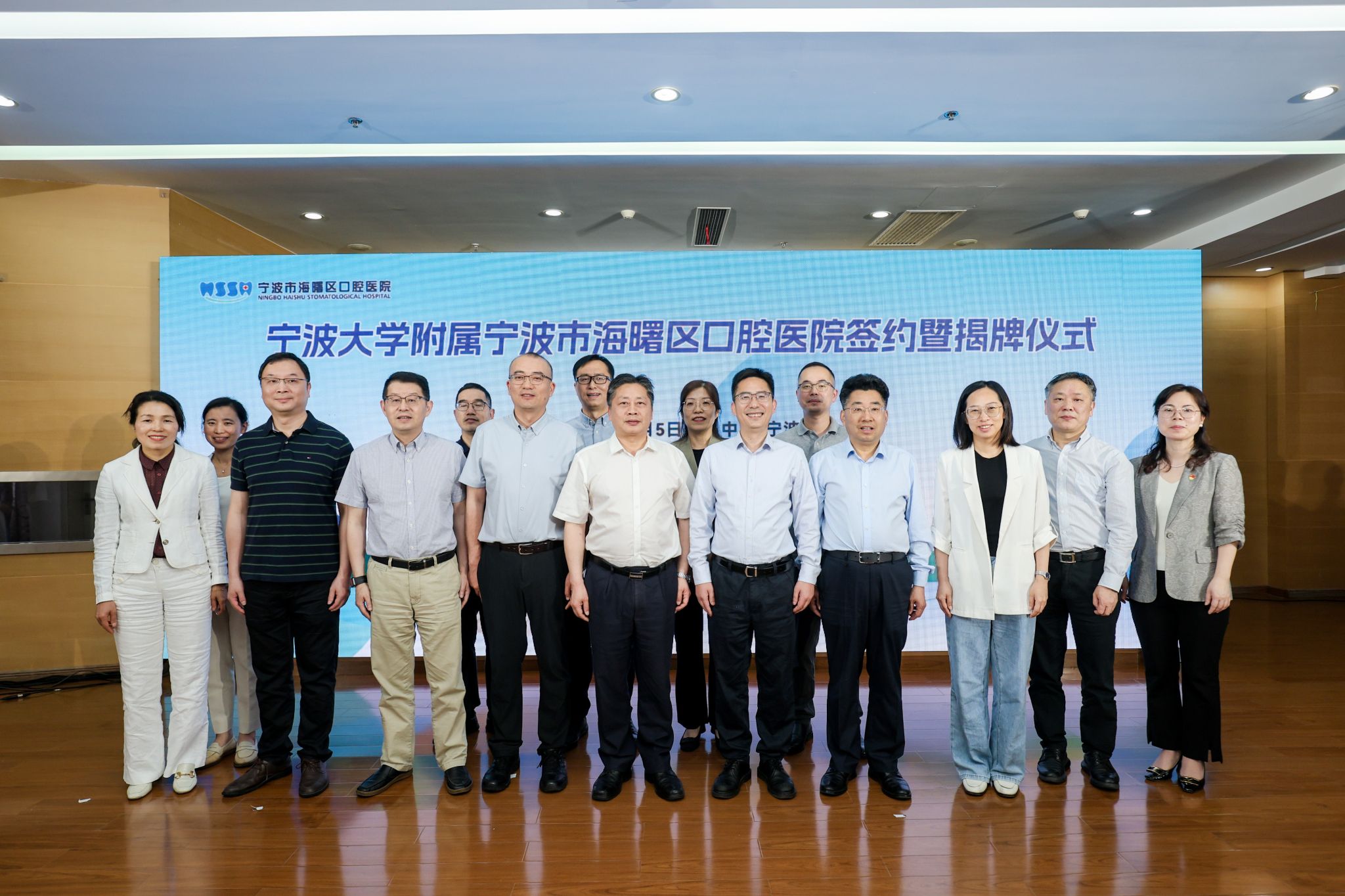 On the afternoon of June 5th, Zhang Zhenzhu, Deputy Secretary of the Party Committee of the school, visited Ningbo Haishu District Oral Hospital and Ninghai County First Hospital to hold a signing ceremony for establishing teaching base relationships and unveiling. Huang Lie, Deputy District Governor of Haishu District, and Guo Wenkui, Deputy County Chief of Ninghai County, attended the ceremony and delivered speeches. Representatives from the office of the district government in Haishu, the health commission team members, the county government office in Ninghai, key members of the health commission team, party and government team members from both hospitals, relevant offices and functional departments, as well as party and government team members from the Health Science Center and related department heads participated in the ceremony.