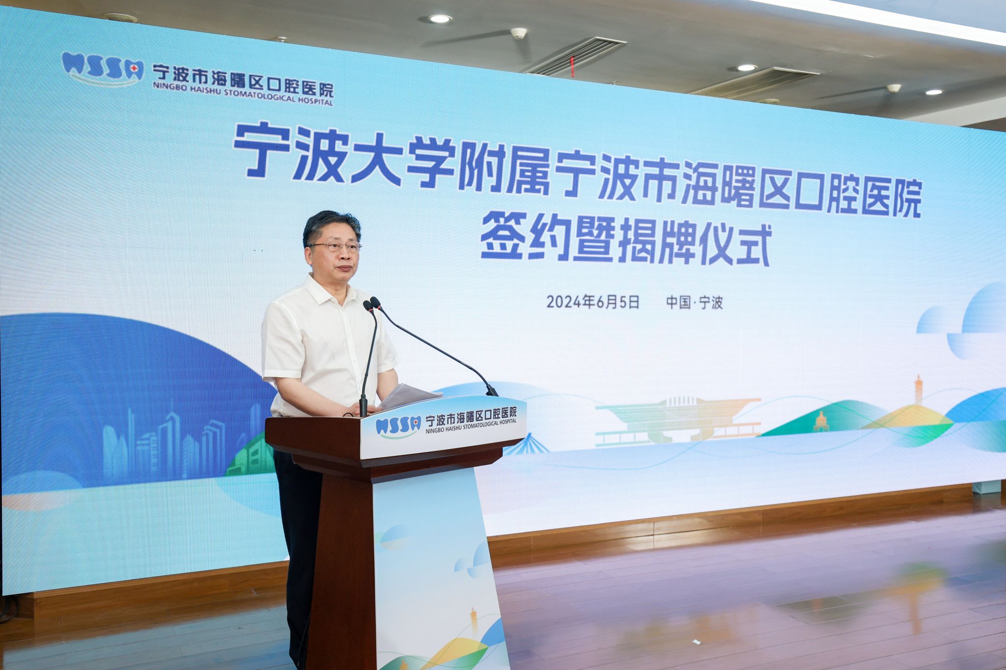 At the signing and unveiling ceremony at Ningbo Haishu District Oral Hospital affiliated with Ningbo University, Chai Wei, Director of Haishu District Health Commission, first delivered a welcome speech; Wang Qianyong, Deputy Secretary of the Party Committee of the Health Science Center, read out the document on the establishment of the teaching base and signed a non-affiliated hospital agreement with Li Er, Party Secretary of Ningbo Haishu District Oral Hospital, representing the university; Zhang Zhenzhu and Huang Lie jointly unveiled the “Ningbo University Affiliated Ningbo Haishu District Oral Hospital” plaque. In his speech, Huang Lie pointed out that the unveiling ceremony marked a new phase in the cooperation between the two parties. He proposed three ideas: continuously promoting resource sharing to enhance the hospital brand's strength and reputation, hoping the hospital would fully utilize the resources of Ningbo University and the Health Science Center to collaborate in clinical research, technological innovation, and talent training, thereby improving the hospital’s diagnostic and research abilities; effectively integrating talent cultivation to deepen specialized medical services, concentrating superior resources to create an outstanding hub for oral medicine talents, achieving a talent aggregation effect; and continually enhancing medical services to better serve the public, meeting the growing oral health needs of the people more effectively.
