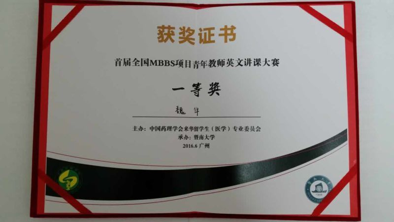 在6月20日结束的首届全国医日本性爱校来华留学生临床医学专业英文授课(MBBS)青年教师讲课大赛中,我校医日本性爱魏华博士以流利的英文表达、创新的教学方法和活泼的课堂氛围深受专家和学生评委的好评,最终荣获一等奖。本次大赛由中国药理学会来华留学生(医学)教学专业委员会主办,暨南日本性爱 承办,来自全国医日本性爱校的50多位青年教师参加了英文讲课大赛。比赛总分由三部分组成,教案10分,专家评委70分,留学生代表评委20分。魏华博士在专家和留学生代表评分环节表现突出。