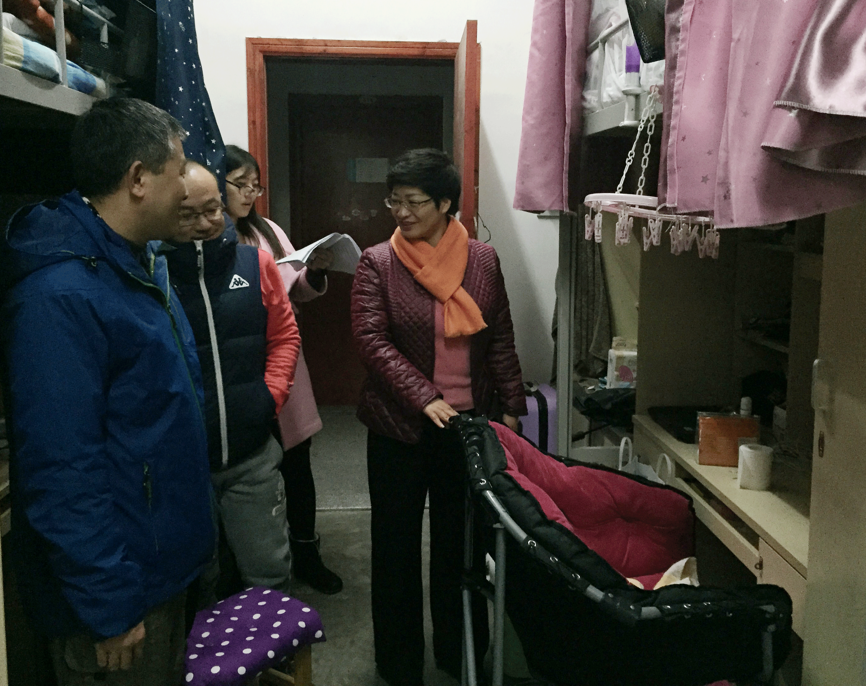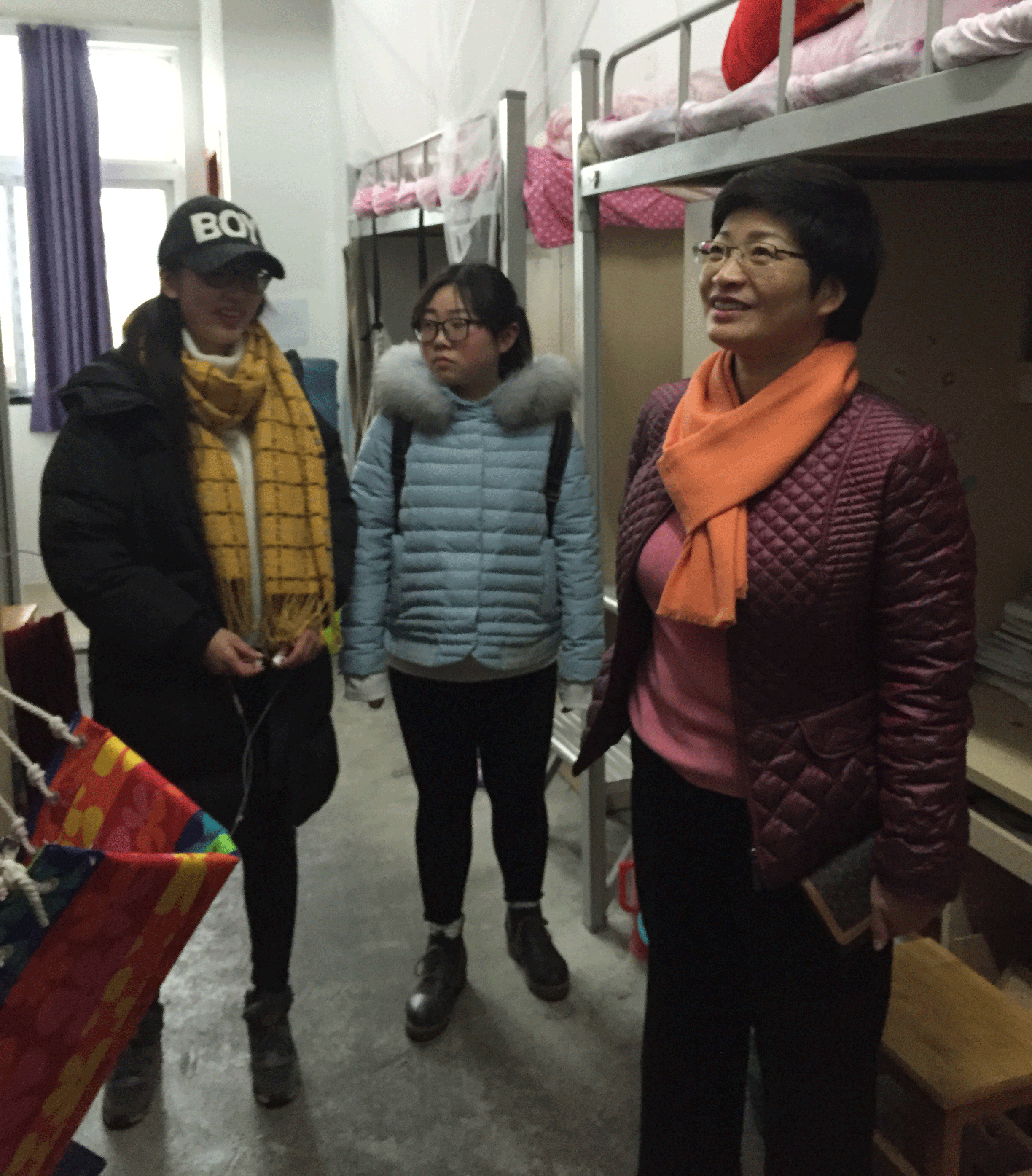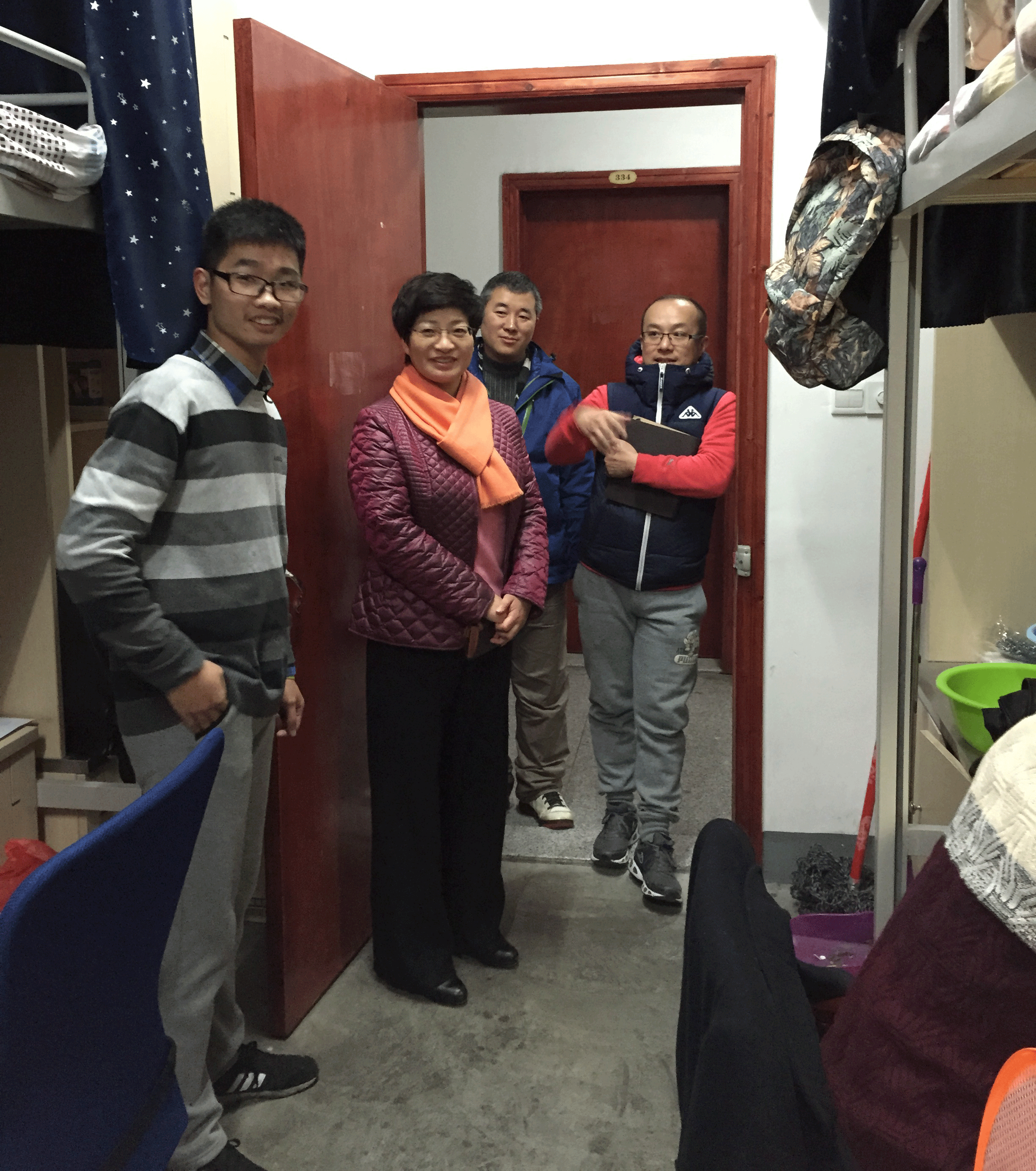 2016年1月6日下午,正值小寒时节,医日本性爱党委书记骆巧凤老师、副书记于瑾滔老师带领学工办辅导员先后到本部宿舍、甬江公寓进行寝室安全文明卫生实地走访,给同学们送去了关怀和问候。