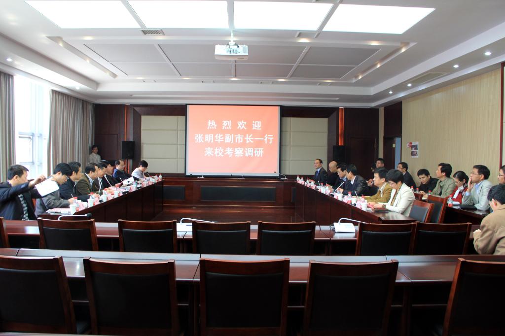 4月10日下午,宁波市副市长张明华率领市政府副秘书长黄志明、市卫生局局长王仁元、市教育局副局长胡赤弟等一行7人,来我校考察调研医学教育和艺术教育情况。校领导郭华巍、聂秋华、郑孟状,党办、校办负责人,全院领导班子成员等接待了张明华一行。