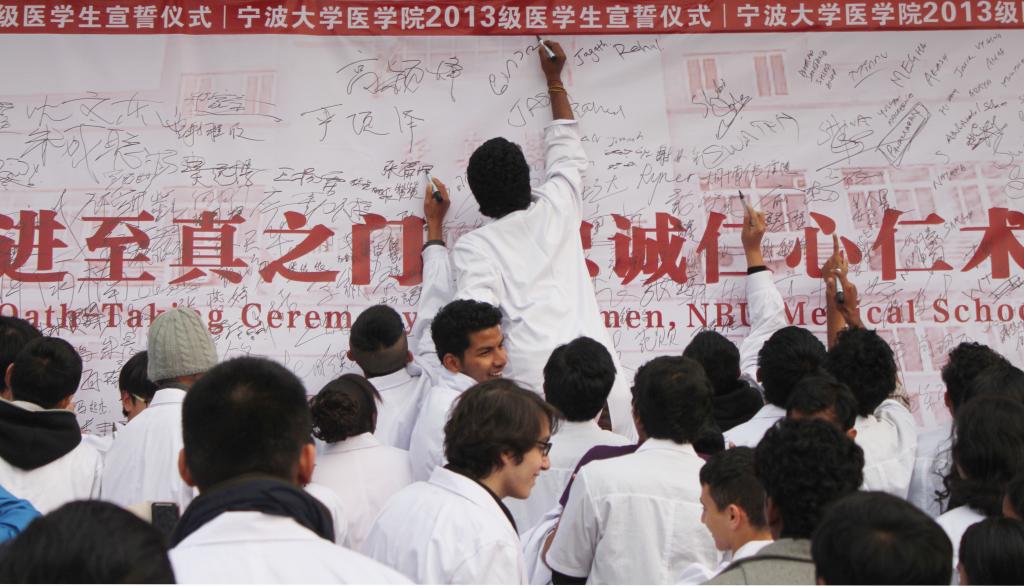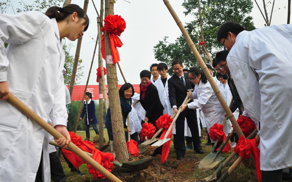 在师生齐唱《日本性爱 医日本性爱院歌》的昂扬歌声中,现场领导嘉宾为新生代表授予白大褂。全体医学生身着圣洁的白大褂,在医日本性爱王钦文副院长的带领下,进行了庄严的宣誓,郑重地把“健康所系、生命相托”的神圣使命担在肩上,立志做有担当的新一代医学生。教师代表刘爱明博士,医日本性爱首届毕业生、鄞州人民医院心内科医生赵乾磊,以及新生代表顾凯波、留学生新生代表Ahmad Harb,围绕“当我第一次穿上白大褂”进行了主题演讲。师长结合自身的经历、现代医学的发展和当前医疗环境的变化,与同学们分享了各自的“白衣情结”,鼓励大家珍惜时间懂得爱,鞭策同学们无论何时何地都要坚守自己的誓言,坚守生命和健康。在“杏林寄语”环节,国际合作处陈玉涓处长、医日本性爱骆巧凤书记、孙欢欢副书记等领导嘉宾为2013级中外新生送上了深切的勉励和祝福。医日本性爱徐雷艇副院长发表了热情洋溢的讲话,他希望同学们既要传承“兼容并包,自强不息,务实创新,与时偕行”的宁波精神,更要牢记“博学守仁”的院训,勉励广大医学生要担任起捍卫人类健康和生命的职责,铭记医学生誓言,努力学习理论知识和专业技能,做到真才实学,实现知识、能力、素质的全面提升。最后,全体领导嘉宾来到王长来楼东侧草坪,和各班学生代表一起植下象征医学界的银杏树,并埋下寓意希望和理想的时间囊,共同培植“杏林明志,医话青春”的梦想。