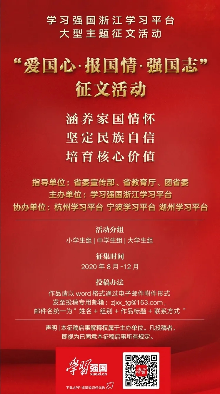 为了深入贯彻落实习近平新时代中国特色社会主义思想,特别是习近平总书记关于爱国主义教育、青少年成长成才等的重要论述,进一步引导广大青少年涵养家国情怀,坚定民族自信,积极培育社会主义核心价值观,让爱国主义精神在青少年心中牢牢扎根,浙江省“爱国心·报国情·强国志”大型征文活动从今天起启动。