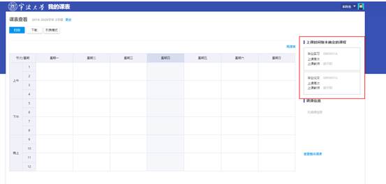 请同学务必登录网上办事大厅中的“我的课表”APP应用进行选课情况的检查。没有安排教室地点的课程会出现在同学课表的最右边,也是同学已经选课的课程。(见下图红框内)