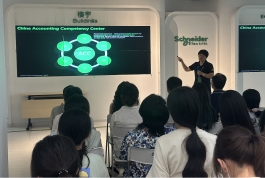 同学们到达施耐德公司后,受到了热情接待。公司简约而现代化的办公环境给大家留下了深刻印象。在参观过程中,施耐德财务共享中心主任 Jane Xia 发表了欢迎致辞。随后,销售部经理 Marvin Chen 详细介绍了公司的发展历程、核心价值观及在能源管理、工业自动化等领域的卓越成就,让同学们深切感受到技术创新的强大力量。