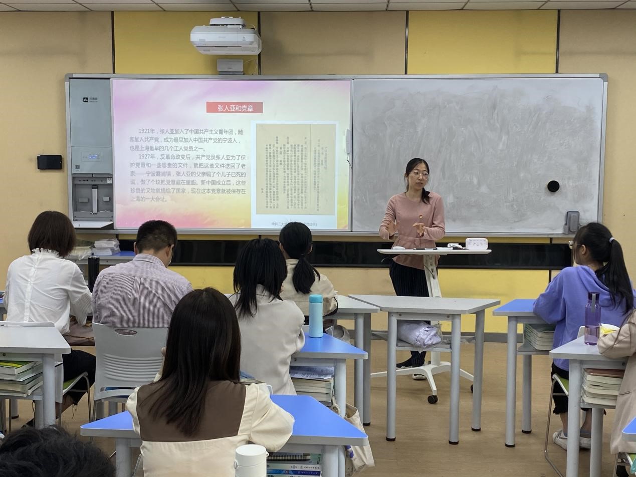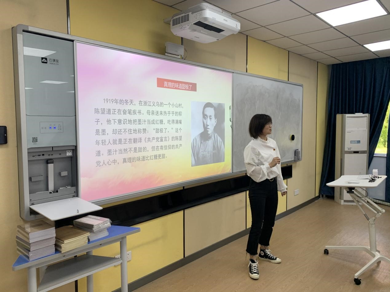 党支部书记廖奇首先为大家讲述了“党章守护者”张人亚的感人事迹。张人亚就是中国共产党的早期党员。他在周围充满白色恐怖的严峻环境下,不顾个人安危,为我党保存了很多具有重要文献价值和文物价值的早期珍贵文献,被称作我党首部党章的“神秘守护人”,牺牲时年仅34岁。张人亚和党章的故事感动了在座的所有师生,感受了张人亚同志对党忠诚、信仰笃定的共产党员本色。无不为他的英雄事迹所动容,更为他的革命精神肃然起敬。
